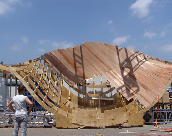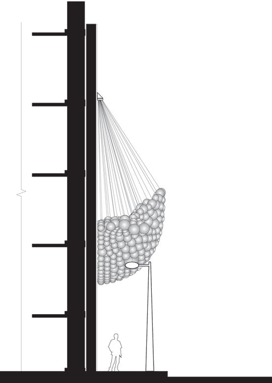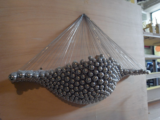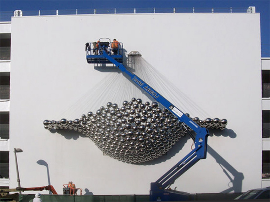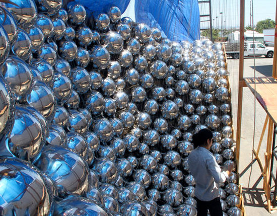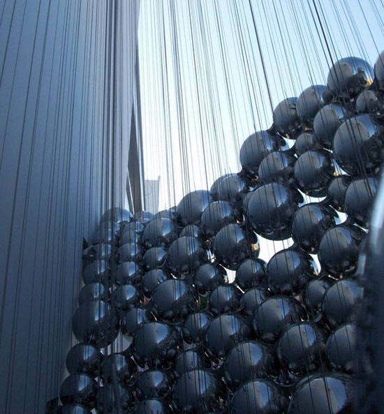 the piece is an aggregation of mirror polished stainless steel spheres and operates structurally