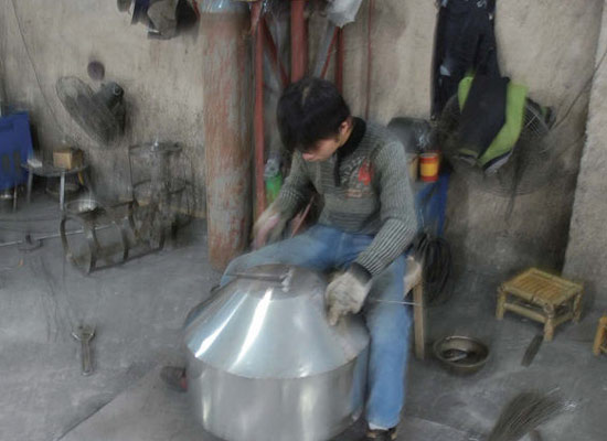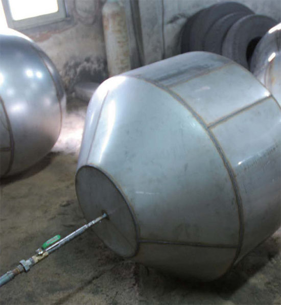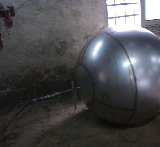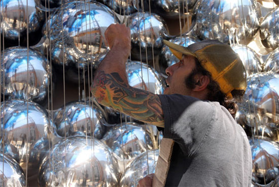 gaston nogues puts hands on the stainless steel spheres installation under construction