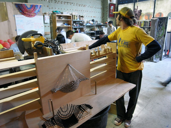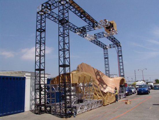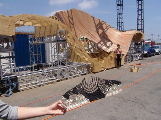 benjamin ball showing a tiny model of the formwork in front of the 'cradle' in santa monica under construction.