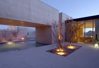 Two accommodation wings lead from the Pavilion into the desert: 16 suites are located within the Desert Wing and another 18 suites together with the Aman Spa are located within the Mesa Wing. Outward views from the resort look over the untouched valley surrounded by lofty bluffs.